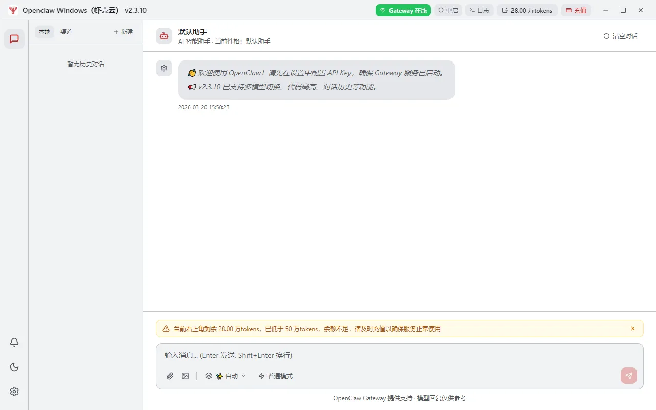 - 右上角:Gateway 状态、重启 / 日志按钮、Tokens 额度