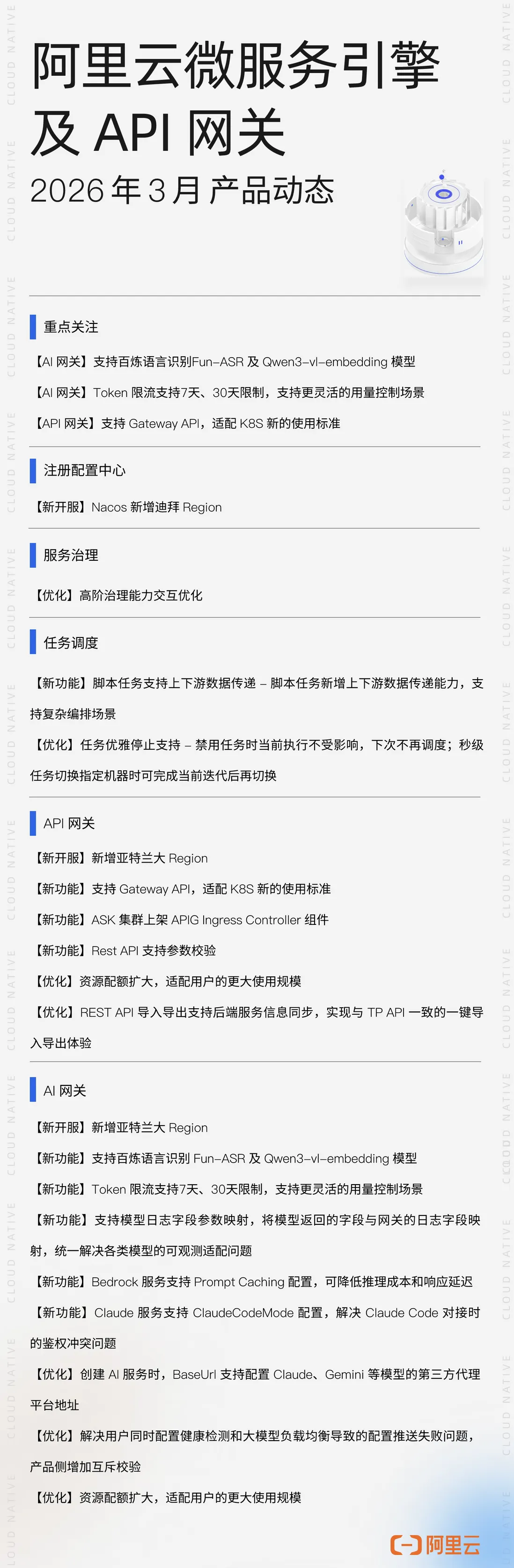 简介: 阿里云微服务引擎 MSE 及 API 网关 2026 年 3 月产品动态。