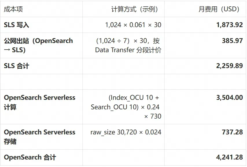 - OpenSearch → SLS 公网出站:按压缩后约为原始的 1/7 估算。