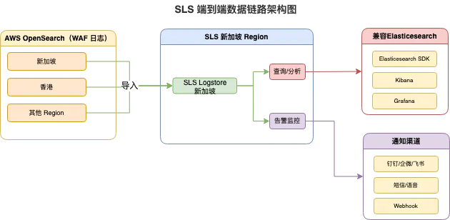以游戏出海企业为例,由于游戏业务对稳定性、已经网络的极至需求,往往会采用多云架构,在不同国家和地区采购不同云产商的资源,其中网络资源是重头,比如CDN、ALB。对应而言,网络监控就成为运维工作的重点,客户选择 SLS 做为运维的统一平台。以 AWS WAF 日志为例,客户通过 Centralized Logging 将 AWS WAF 访问日志接入 AWS OpenSearch,再通过 SLS 的 OpenSearch 导入功能,最终将数据写入 SLS 实现网络监控。新架构的目标是实现: