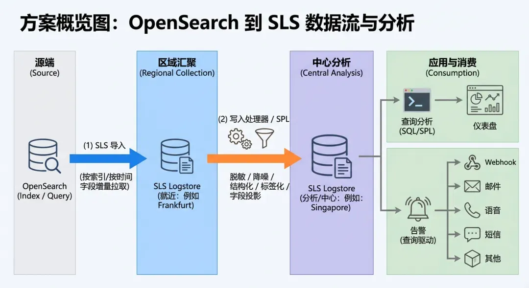 - 第一步(导入方案,先获得 SLS 的使用体验):通过 SLS 的 OpenSearch 数据导入能力,把历史 + 增量数据同步到 SLS,快速落地查询分析、仪表盘与告警联动,在不改业务读写链路的前提下先把可观测闭环跑起来。