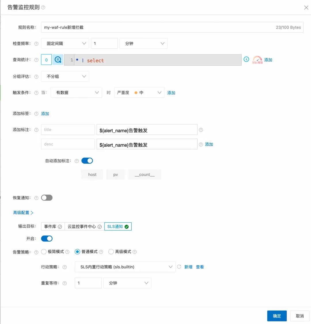 - SLS 告警功能定时分析 WAF 访问日志,发现异常时通知至监控者。