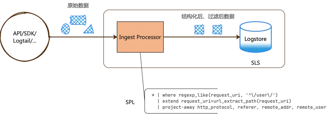 数据写入 Logstore 前,可以使用写入处理器(IngestProcessor)在入库前对数据进行处理,例如数据过滤、字段提取、字段扩展、数据脱敏。如下图所示: