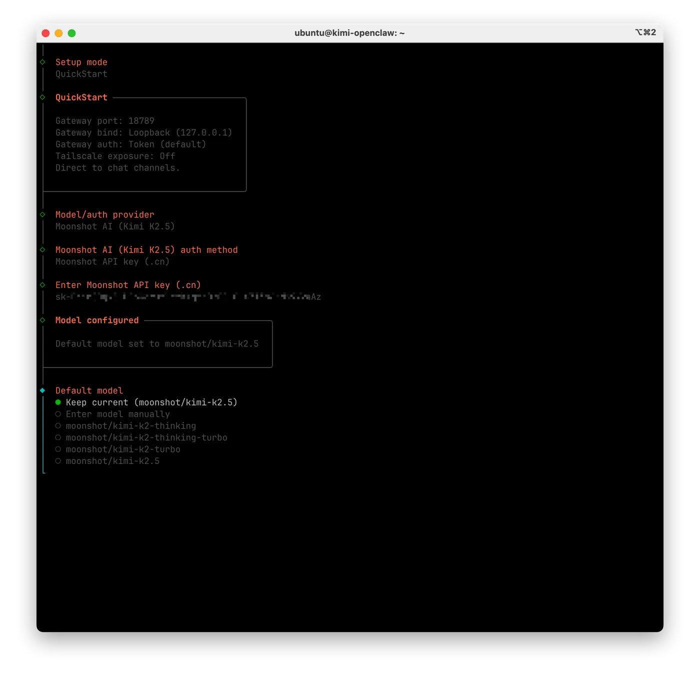 - 将复制的API Key贴入终端并敲击回车,然后选择Moonshot/Kimi-K2.5模型并敲击回车确认。