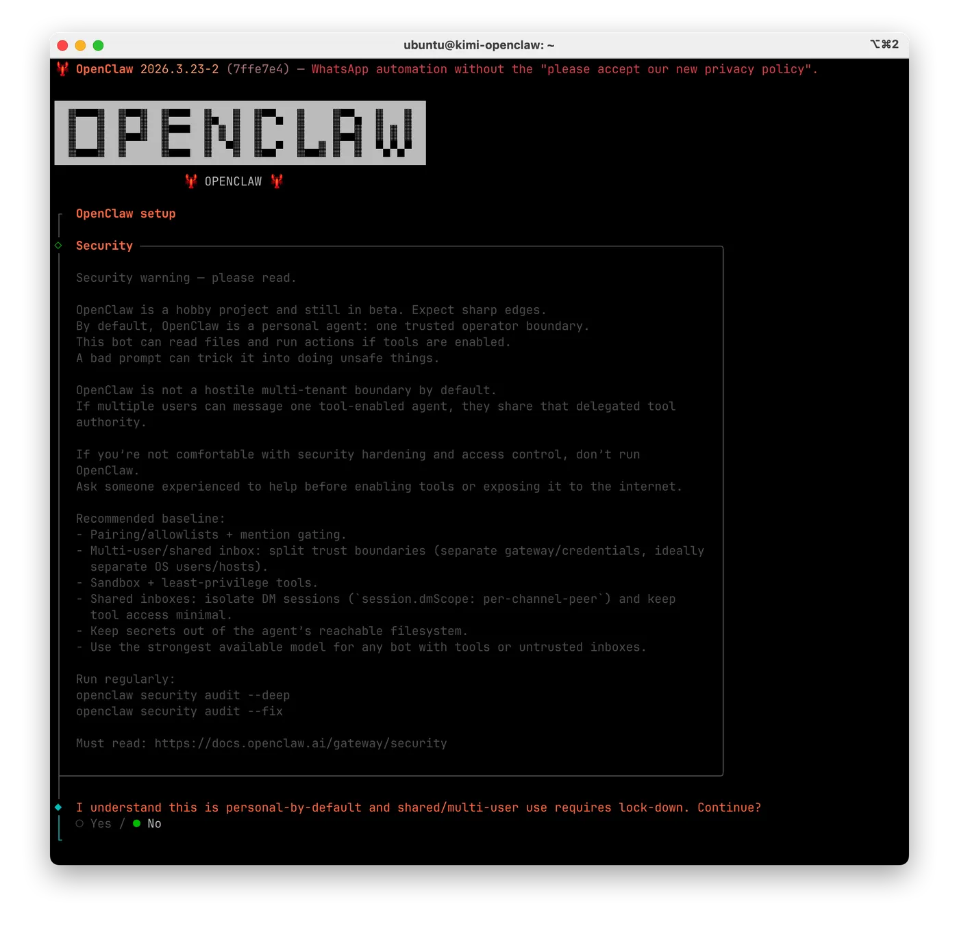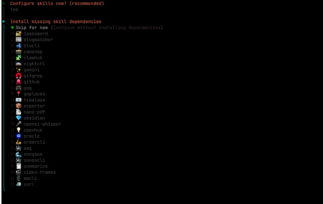 - 选择你OpenClaw的技能和一些配置,选择Yes