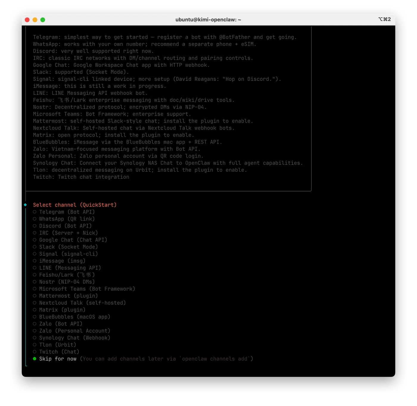 - 选择与OpenClaw聊天的载体,我们可以先跳过,使用tui进行体验。