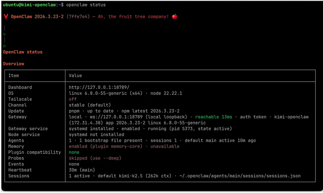 - 输入 openclaw status 可查看当前状态