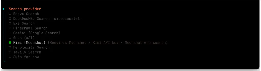 - 选择网络搜索提供商,选择Kimi