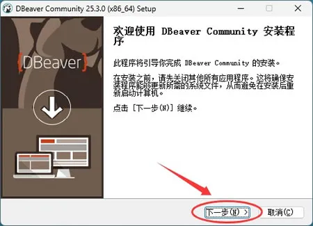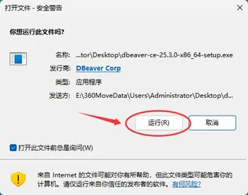 1) 下载 dbeaver-x86_64-setup.exe 安装程序(新版安装过程是类似的),双击启动,出现下图安全警告窗口的话,直接点击“运行”:
