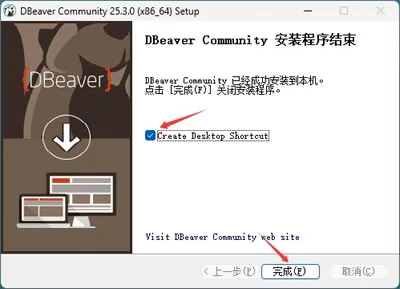 10) 出现下图(建议勾选上,这样桌面上会自动添加 DBeaver 的图标),表示安装完成: