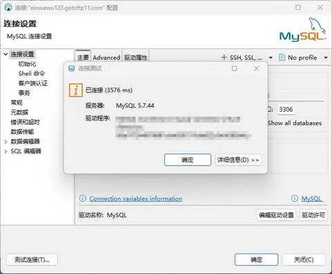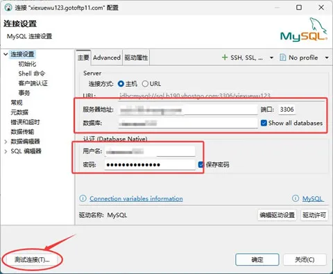 4) 输入远程数据库的信息,包括服务器地址、数据库名称、用户名和密码,然后点击“测试连接”:
