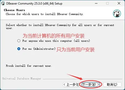5) 需要个人情况自由勾选是否只为当前用户安装,然后点击“下一步”: