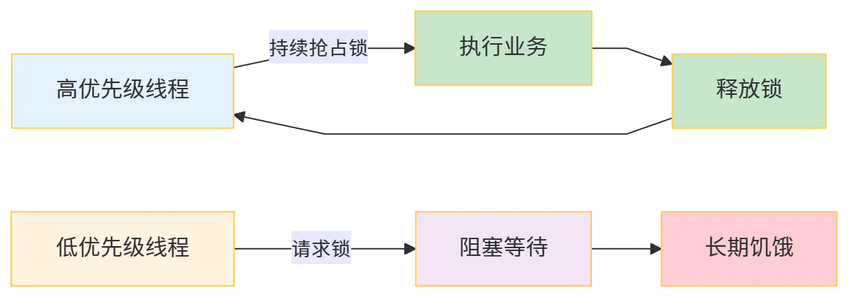 饥饿是指线程因优先级过低、锁竞争策略不合理,长期无法获取CPU执行权或锁资源,导致业务永久无法执行的现象。