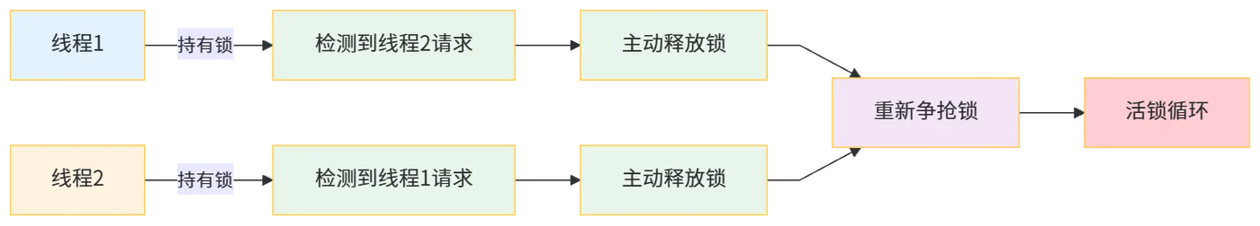 | 活锁 | 线程不断释放锁又重新争抢,无法执行业务 | RUNNABLE | 持续消耗CPU |