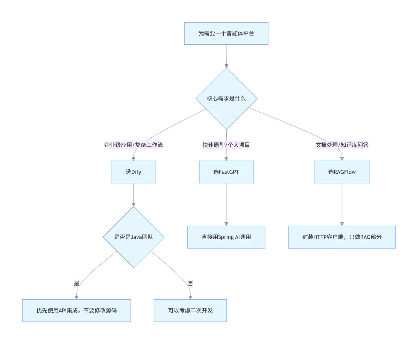 对于绝大多数Java开发者来说,Dify是最稳妥的选择。它最成熟,生态最好,和Spring集成最方便,能够满足绝大多数企业级应用的需求。FastGPT适合快速原型和个人项目,RAGFlow只适合文档密集型的特殊场景。