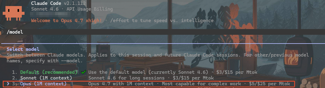 如果你在用 Claude Code(VS Code 或 JetBrains 插件),更新到最新版本后,Opus 4.7 会自动成为默认模型,推理级别默认 xhigh。