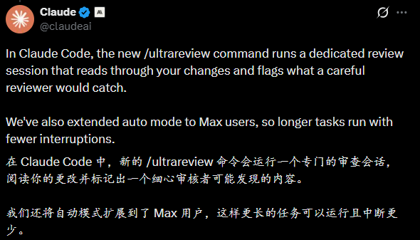 /ultrareview 是 Claude Code 新增的命令。你在代码合并前运行它,它会在云端启动一批审查 Agent 并行扫描你的代码,找 bug。每个发现都会被独立复现和验证,不是随便报一个就算。
