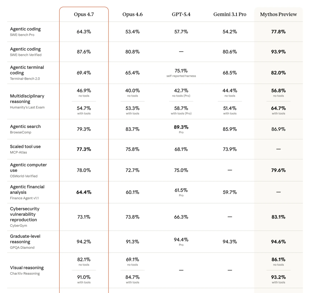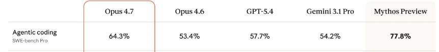 SWE-bench Verified:Opus 4.7 87.6%,Opus 4.6 是 80.8%,Gemini 3.1 Pro 是 80.6%,不过这里的编码能力还是比不上那个危险模型“Mythos”哈哈