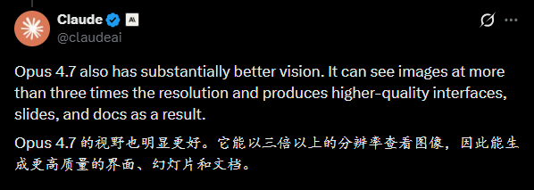 Anthropic 官方对 Opus 4.7 的定位里,专门提到了"high-resolution vision"——高分辨率视觉。