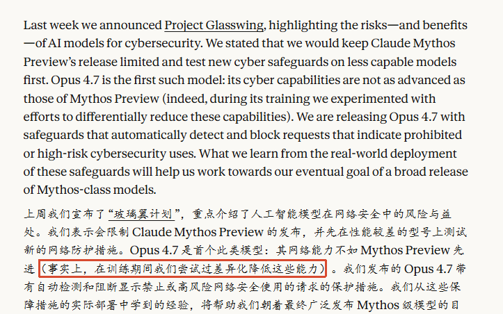这个有点意思。Anthropic 在训练 Opus 4.7 的时候,故意削弱了它的攻击性网络安全能力,同时加入了自动检测机制,会自动阻止高风险的网络安全请求。