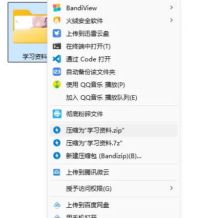 首先,我们在这个学习资料的目录上,鼠标单击右键,选择压缩为xxxxx.zip这个选项