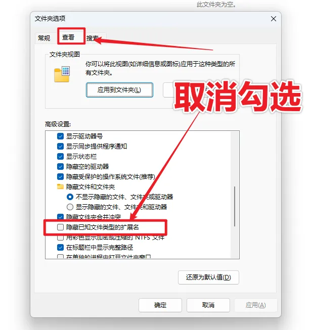 在下面的高级设置中找到隐藏已知文件类型的扩展名 把前面的对钩去掉!