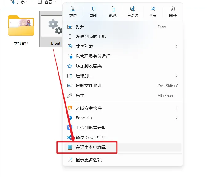 接着继续在这个b.bat文件上右键选择在记事本中编辑
