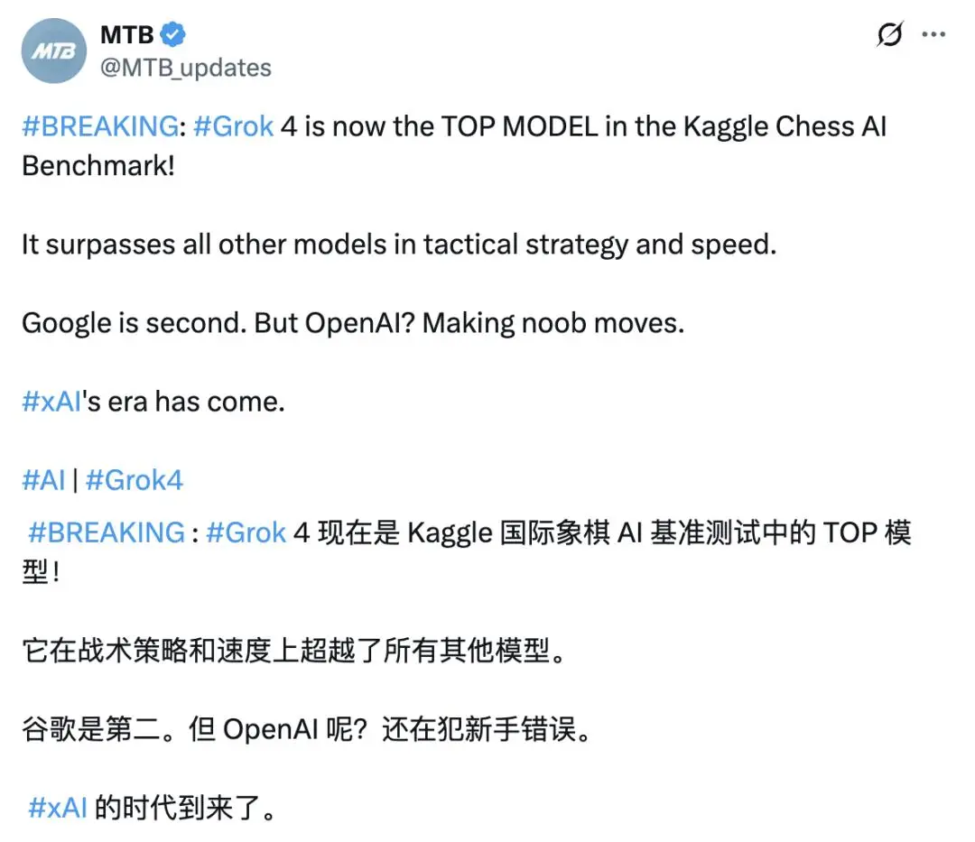 最新战报:Kaggle AI国际象棋竞赛激战正酣,Grok 4表现抢眼,马斯克自豪不已。