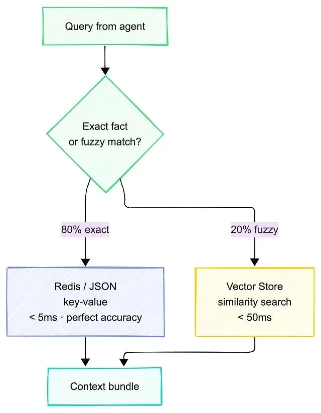JSON/Redis 负责需要的 80%(零延迟、完美准确率),向量搜索则负责剩下那 20% 需要模糊匹配的部分。