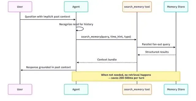 Agent 自己决定什么时候召回,而不是 orchestrator这样可以在不需要记忆的那些轮次里每轮省下 200–500ms。