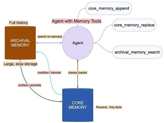 Agent 通过显式函数调用,把事实在 core(类 RAM)和 archival(类磁盘)之间挪动。