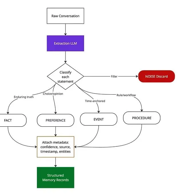 一个 LLM 读取对话,把每一条信息归入类型化记录:事实、偏好、事件、过程。每条记录带四个属性:置信度分数(0.0–1.0)、关联实体(用于图谱构建)、时间戳,以及来源——是用户直接说的、Agent 推断的,还是工具返回的?