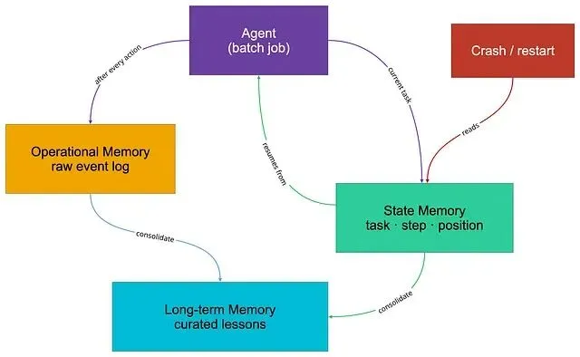 三层:原始日志、当前状态、策展过的经验教训;崩溃后读取状态记忆,从上个检查点续跑。