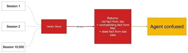 向量存储无限增长:跑过 1 万个会话之后,检索会把数月前的矛盾事实和昨天的更新混在一起一并返回。