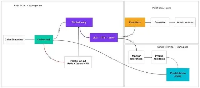 与此同时,Slow Thinker 已经听到开场静默,在预取可能的下一个话题。当 Sarah 说 "Actually, I wanted to update the delivery address," 时,她的地址历史已经在缓存里热着——下一条响应落地 150ms,而不是 400ms。