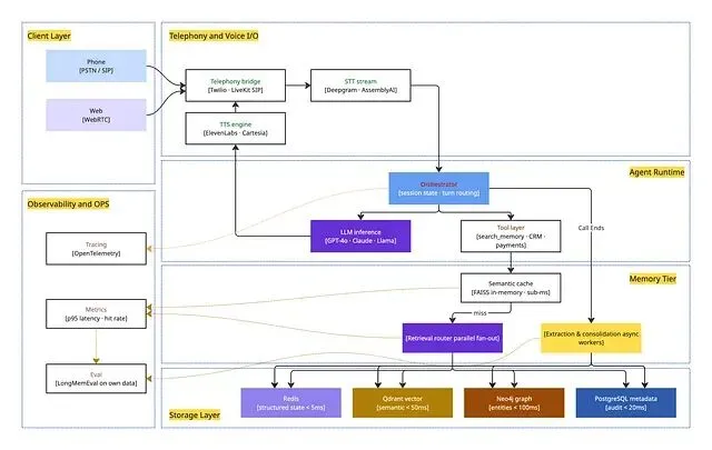 电话与语音 I/O 自成一层,Twilio 换成 LiveKit 不必动 Agent,Deepgram 换成 AssemblyAI 不必动记忆。记忆层独立于 Agent 运行时,同一层记忆可以服务销售、客服、引导多个 Agent,不必重复检索逻辑。存储是类型化而非单体的:Redis 存状态、Qdrant 存向量、Neo4j 存实体、PostgreSQL 存审计;AWS AgentCore 报告并行 fan-out 时端到端约 200ms。可观测性本身是一层,不是事后补丁——仪表板上没有 p95 检索延迟、缓存命中率、记忆精确度,就调不了上一节那堆失效模式。
