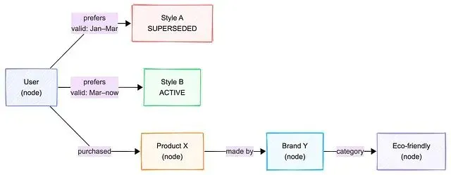 事实是带有效期窗口的边——旧偏好仍可查询,但被标记为 SUPERSEDED。