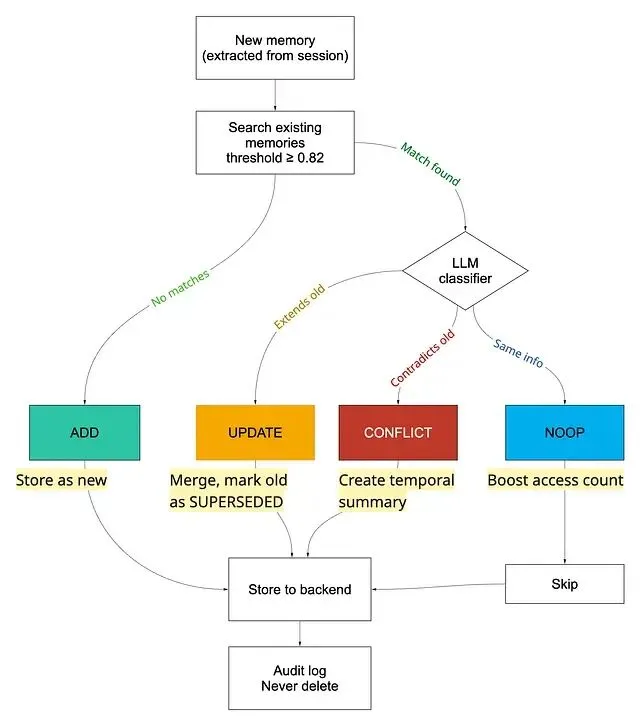 每条新记忆都会被归类为 ADD、NOOP、UPDATE 或 CONFLICT——最后这种最难处理。
