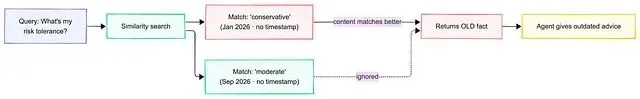 相似度搜索按内容而非近因挑最接近的匹配——旧事实把新事实压了下去。