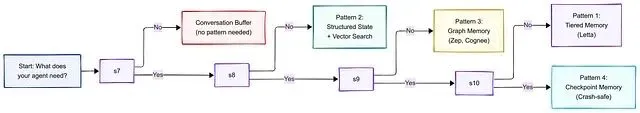 经验法则:从模式 2(结构化状态 + 向量搜索)开始,它能解决 80% 的用例;只在需求清楚要求时再往上加复杂度。