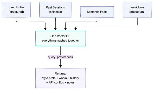所有记忆类型都倒进同一个存储——检索到的是一锅无关内容的大杂烩。