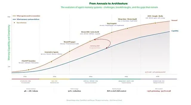 下图的橙色线是 Agent 需要记住的内容,蓝色线是记忆系统实际交付的内容。两者之间的裂缝正是生产级 Agent 失效的地方;裂缝在收窄但没有合上。