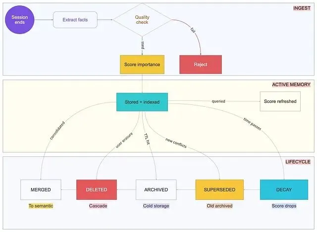 完整的记忆生命周期——从摄入、活跃使用,到衰减、归档、删除。