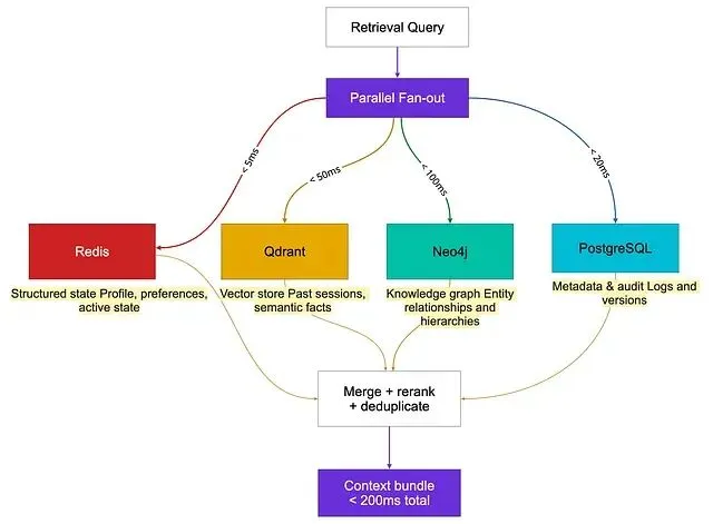 架构原则:查询要并行 fan-out 而不是串行,检索总预算应保持在 200ms 以内。AWS AgentCore 报告语义搜索端到端约 200ms。