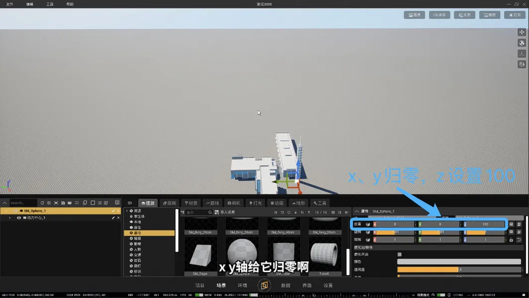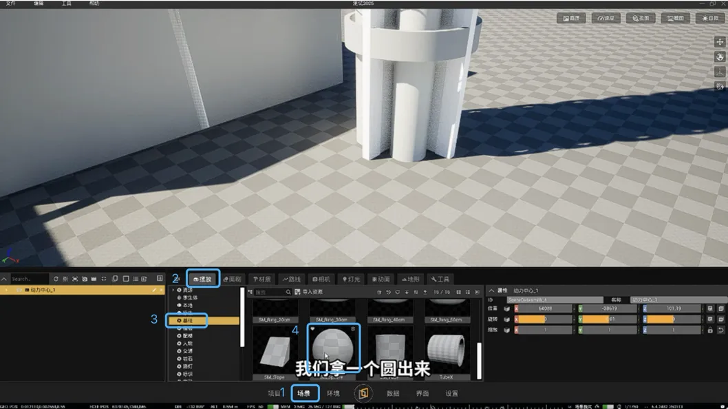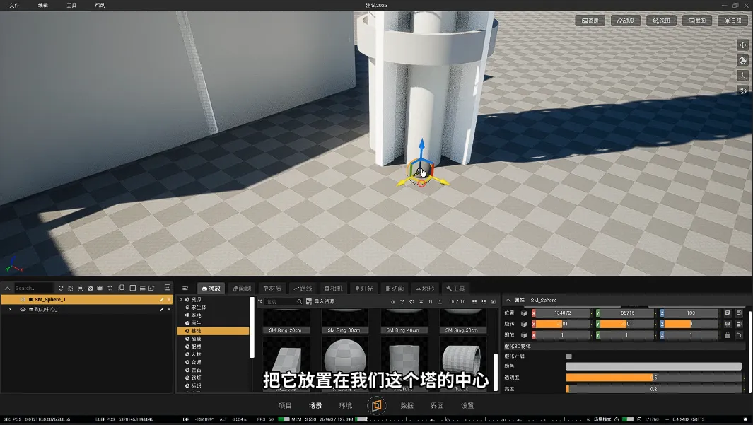 3. 点击【场景】【摆放】-【基础】-选择一个圆球,放置在塔的中心