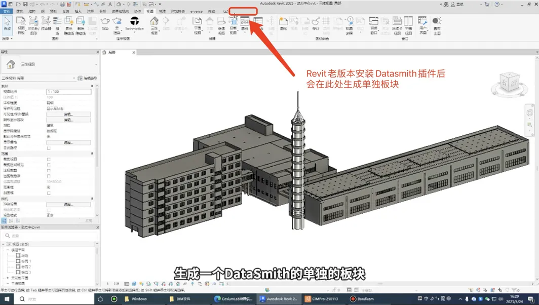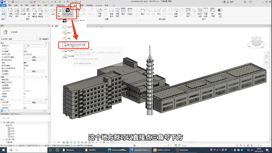 (Revit2024年以前的老版本需要安装Datasmith插件,可在CIMPro孪大师官网漂视CIMPro孪大师-数字孪生融合引擎-零代码二次开发-上海漂视下载,安装好后会在Revit上方工具栏最右侧显示)