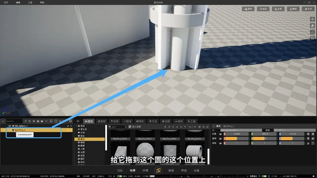 4. 把动力中心拖出来放到前一步摆放的圆的位置,然后把【位置】归零