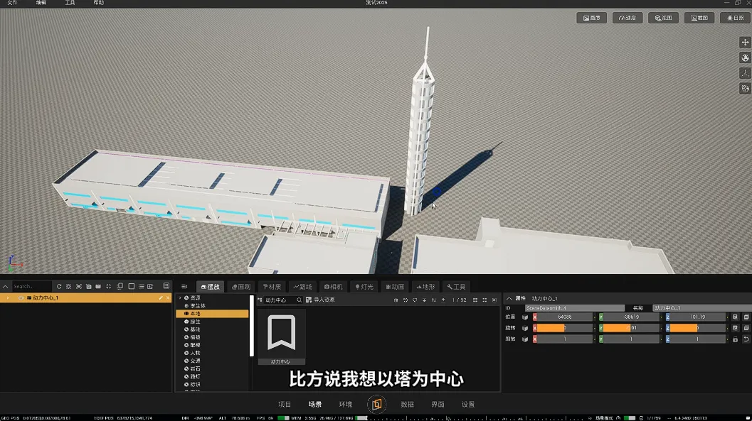 2. 选择你想设置为中心的物体,此处以塔为示例