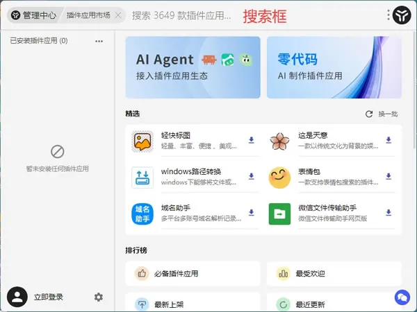 呼出搜索框后,输入"插件市场"进入插件中心。浏览或搜索需要的插件,点击"获取 "按钮即可。大多数插件都是免费的,安装后立即生效。