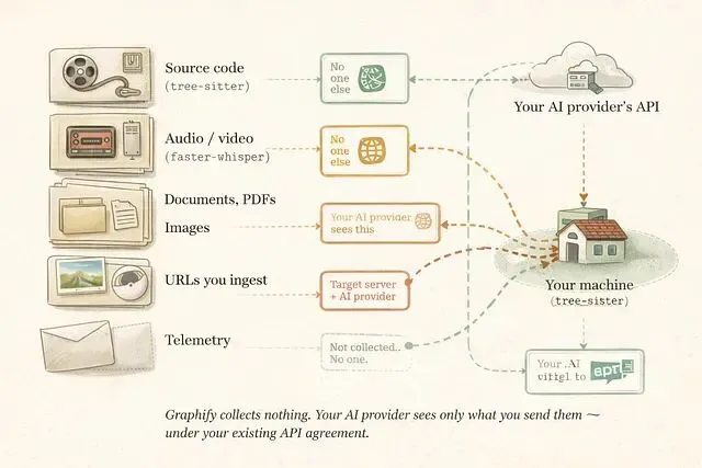 Graphify 自己什么都不收。SECURITY.md 写得很直白:"在图谱分析期间不发起任何网络调用。"项目同时声明:没有遥测、没有使用追踪、没有任何形式的分析。Graphify 也不存凭证。
